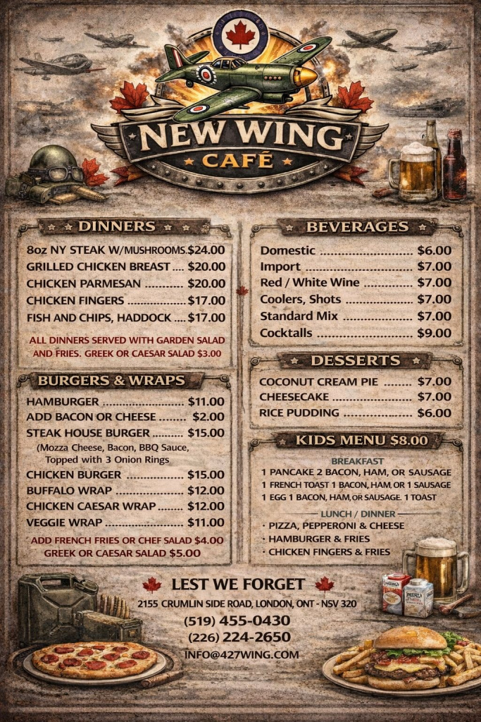 New Wing Cafe open Tuesday-Sunday – 8:00 am to 7:00 pm located at 427 (London) Wing – 2155 Crumlin Side Road, London, Ontario